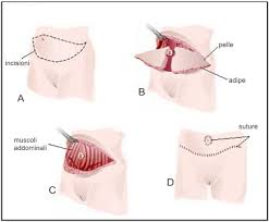 Si effettua un’incisione orizzontale sovra pubica e, quando necessario, una seconda incisione circolare intorno all’ombelico. La lunghezza dell’ icisione sovra pubica varia a seconda della quantità di cute da asportare.